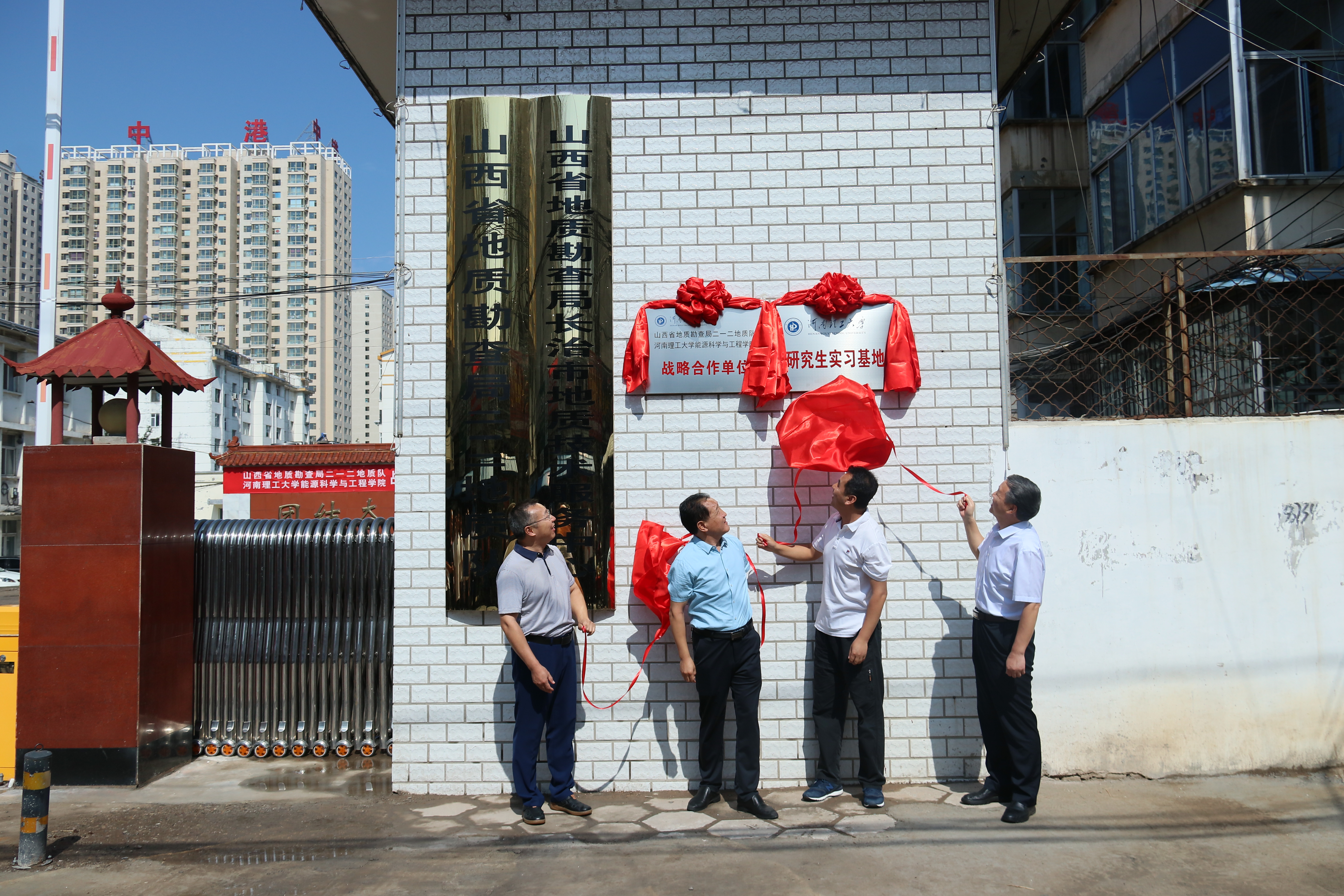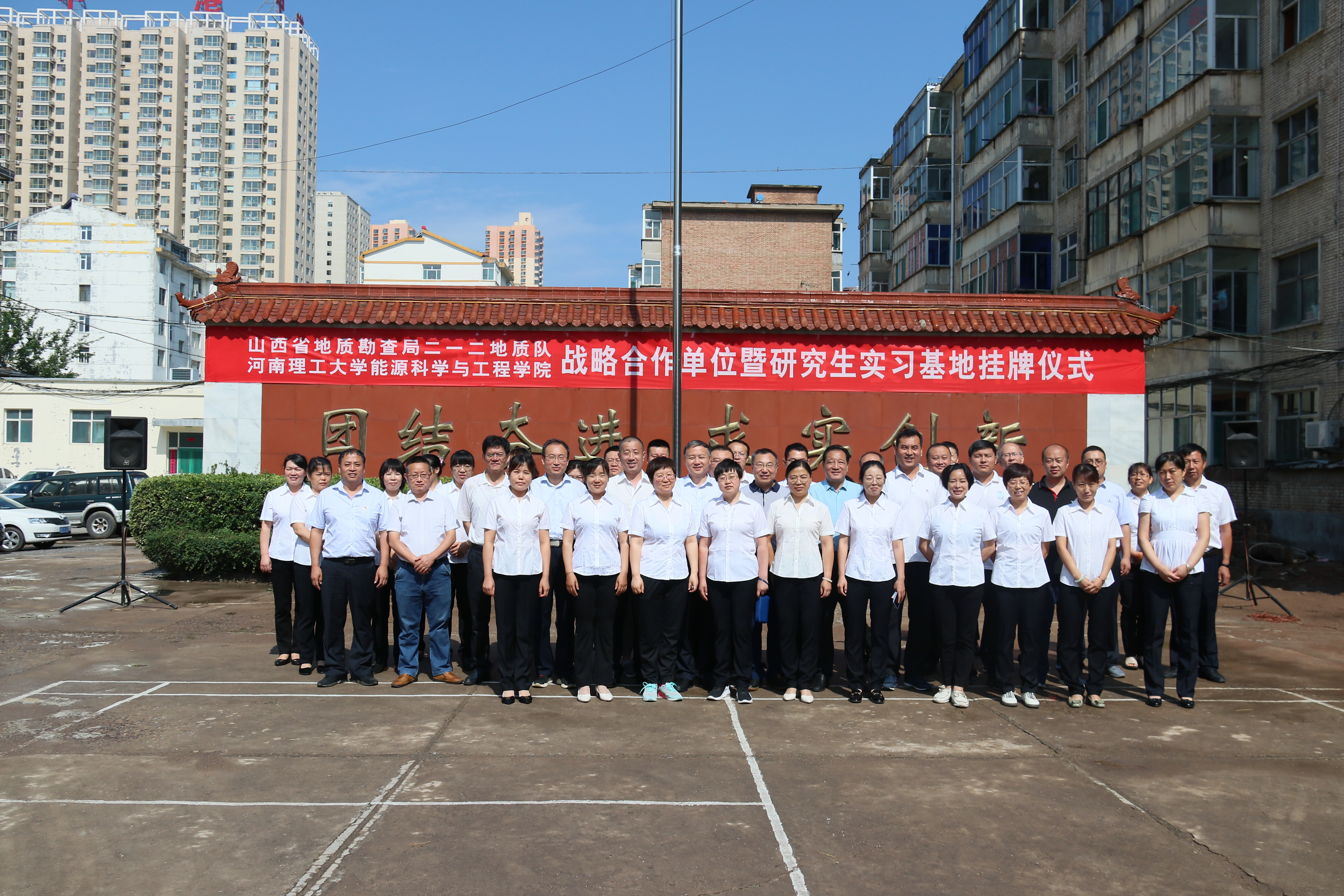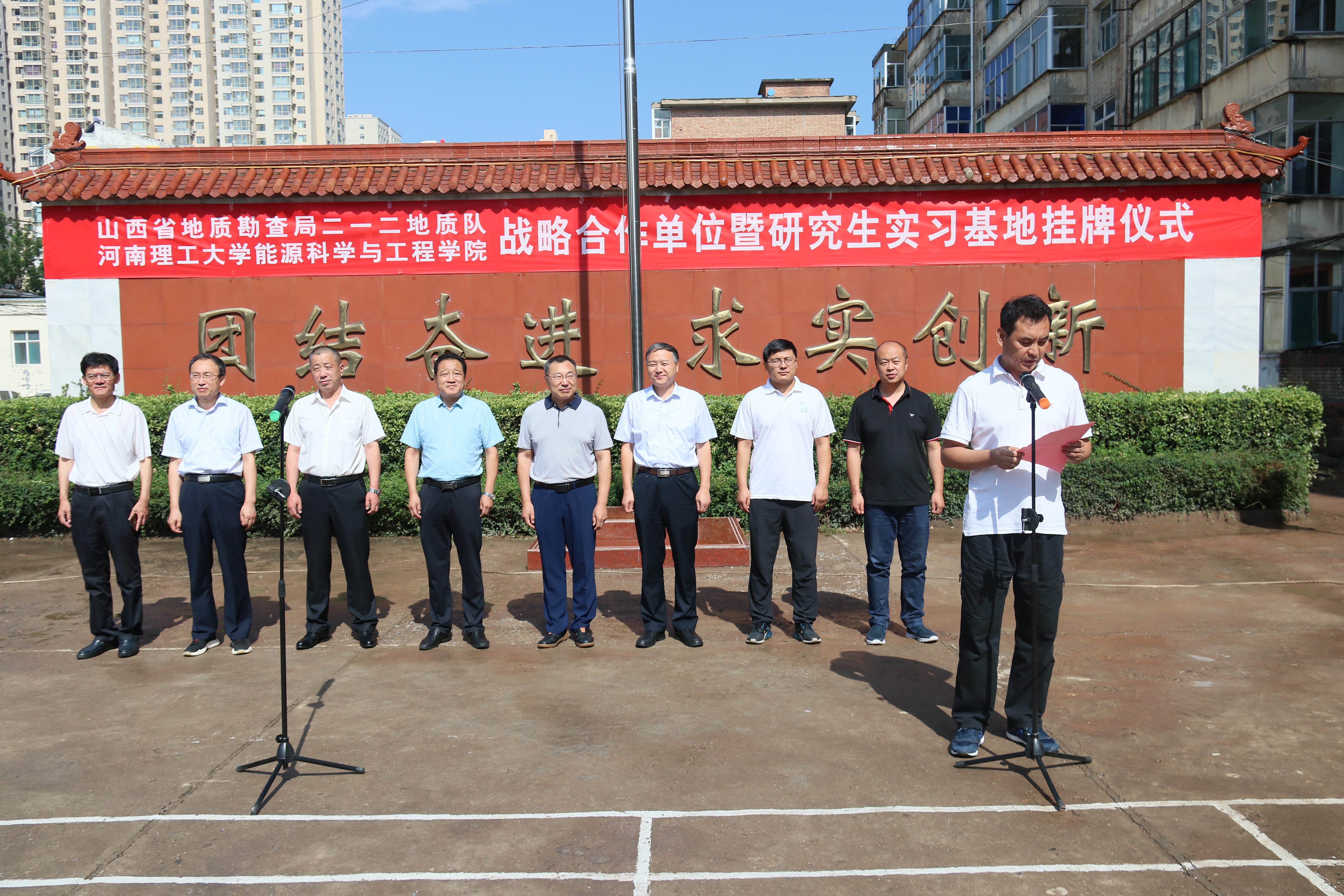 7月9日上午,能源麻豆传媒映画 与山西省地质勘查局二一二地质队在二一二队部举行战略合作单位暨研究生实习基地挂牌仪式。能源麻豆传媒映画 党委书记康全玉、院长郭文兵、副院长刘少伟、煤与煤层气教研室支部书记刘晓、二一二地质队队长贺海青、队党委书记曹拥军等100余人参加了挂牌仪式,仪式由二一二地质队党委书记曹拥军主持。