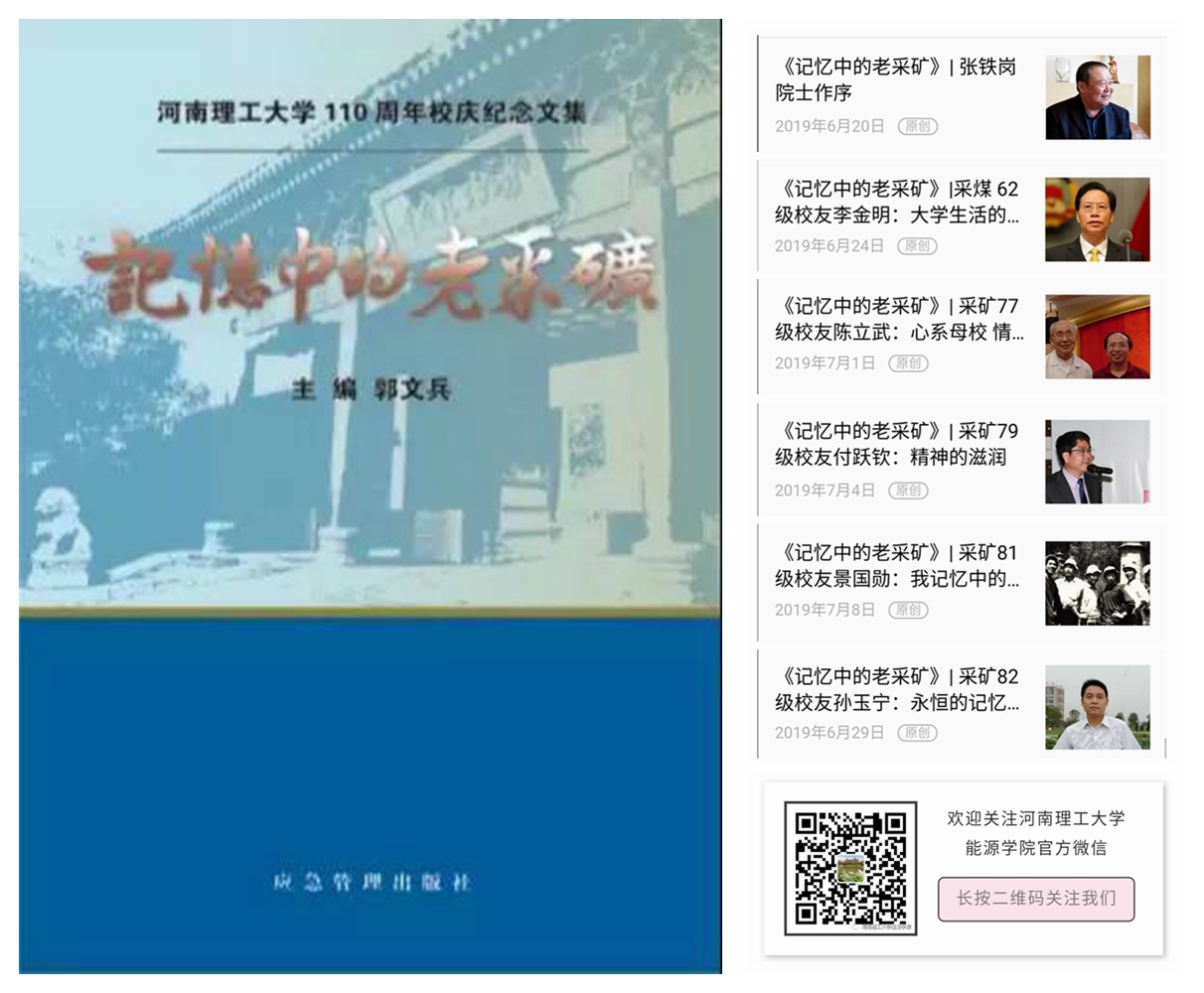 目前,《记忆中的老采矿》和《麻豆传媒映画 史》编纂工作基本完成并交由出版社审稿,将于校庆前夕出版问世。自6月21日起,能源麻豆传媒映画 官方微信公众号启动了《记忆中的老采矿》精选文章连载,文章一经发布便在广大老采矿校友群体中广泛传播,学校校友总会连续转载麻豆传媒映画相关的文章,在广大师生、校友中形成较大影响,为学校110周年校庆营造了浓厚的氛围。