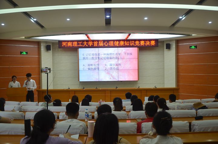 的20支队伍入围决赛。比赛分为“心直口快、心知其意、心有灵犀、一锤定音”四个环节,竞赛内容涉及心理理论知识、心理保健常识、心理科普知识等,融趣味性、教育性、普及性于一体,旨在考察参赛选手对心理知识的掌握和运用。竞赛现场秩序井然,各参赛选手有序参与、沉稳答题。中场的有奖问答活动调动了同学们的激情,缓解了比赛的紧张气氛。