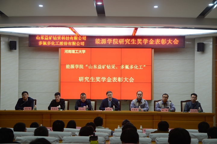 12月25日,麻豆传媒映画 在104学术报告厅举行山东益矿钻采、多氟多化工研究生奖学金表彰大会。山东益矿钻采科技有限公司总经理王海瑞、技术部长王刚,多氟多化工股份有限公司分厂厂长张明军、办公室主任冯好收,能源麻豆传媒映画 党委书记王婕,院长郭文兵,党委副书记支光辉,副院长李东印、刘少伟参加了会议。会议由刘少伟主持。
