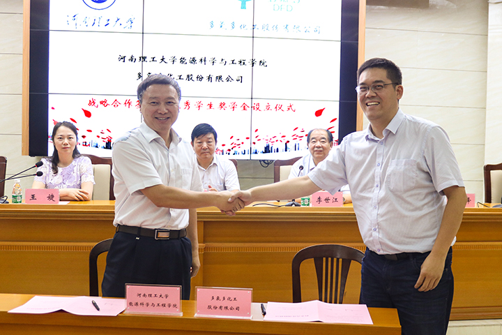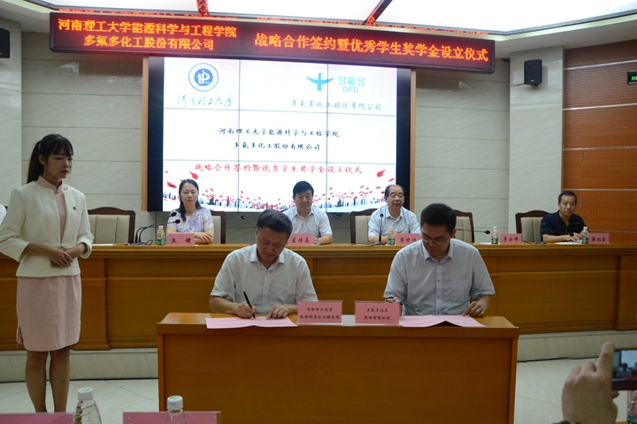院长郭文兵与多氟多化工股份有限公司副董事长李云峰代表双方签署了“战略合作暨奖学金设立协议”。多氟多化工股份有限公司副总经理薛旭金、麻豆传媒映画