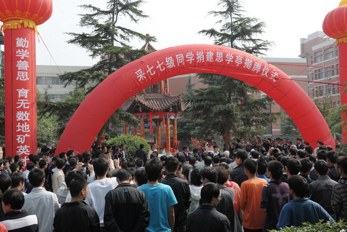 仪式伊始,景国勋代表学校党委、行政和全校师生员工对采煤77级校友的到来表示热烈的欢迎!对大家长期以来对母校的关心和支持表示衷心的感谢!他指出,“思学亭”是学校采矿77级108名学子感恩母校培育之情捐资修建的,其名字取义于论语“学而不思则罔,思而不学则怠”,而且“思”字一语双关,表现了对母校的深切思念。同时,“思学”寄语在校的同学要以校友为榜样,不断砥砺品质,打牢文化基础,提升创新能力,常怀感恩之情,以便更好地奉献社会。近年来,学校在学科建设、师资队伍建设和教学科研方面取得的成就,与广大校友的关心和支持是分不开的,思学亭的建成将成为我校又一个靓丽的文化景观,激励着广大师生自强不息、奋发向上,为加快建设特色鲜明的多科性高水平的综合大学而努力奋斗。