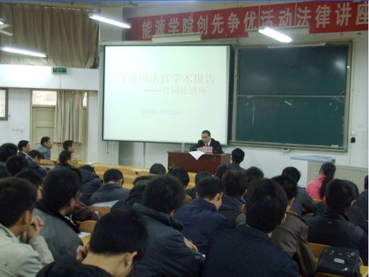 报告会上,拜建国首先简要介绍了技术合同法的有关内容,即技术合同法由非职务开发技术成果、职务开发技术成果、委托开发技术成果和合作开发技术成果的归属四个方面组成。在讲到有关职务技术成果合同时,他结合教师工作做了具体讲解。随后,他详细介绍了《劳动合同法》。他说,《劳动合同法》属于经济法中的劳动保障法。劳动合同分为固定期限合同、无固定期限合同、已完成一定工作任务为期限的劳动合同,与劳动者关系最为密切。在谈到合同法与毕业生关系时,他结合2011级毕业生境况,从反面案例入手,为同学们做了深入浅出的讲解,他表示无固定期限合同能最大程度地保护劳动者在黄金年龄的合法权益,与同学们关系最为密切。此外,拜建国还就签订合同、违约金条款、劳动合同无效的情况和不同时期的加班工资情况做了介绍,并耐心详细地对同学们的提问做了解答。最后,魏平儒总结了拜建国法官的精彩讲解,告诫在场人员要知法、学法、守法、懂法,学会利用法律武器维护自身的合法权益。