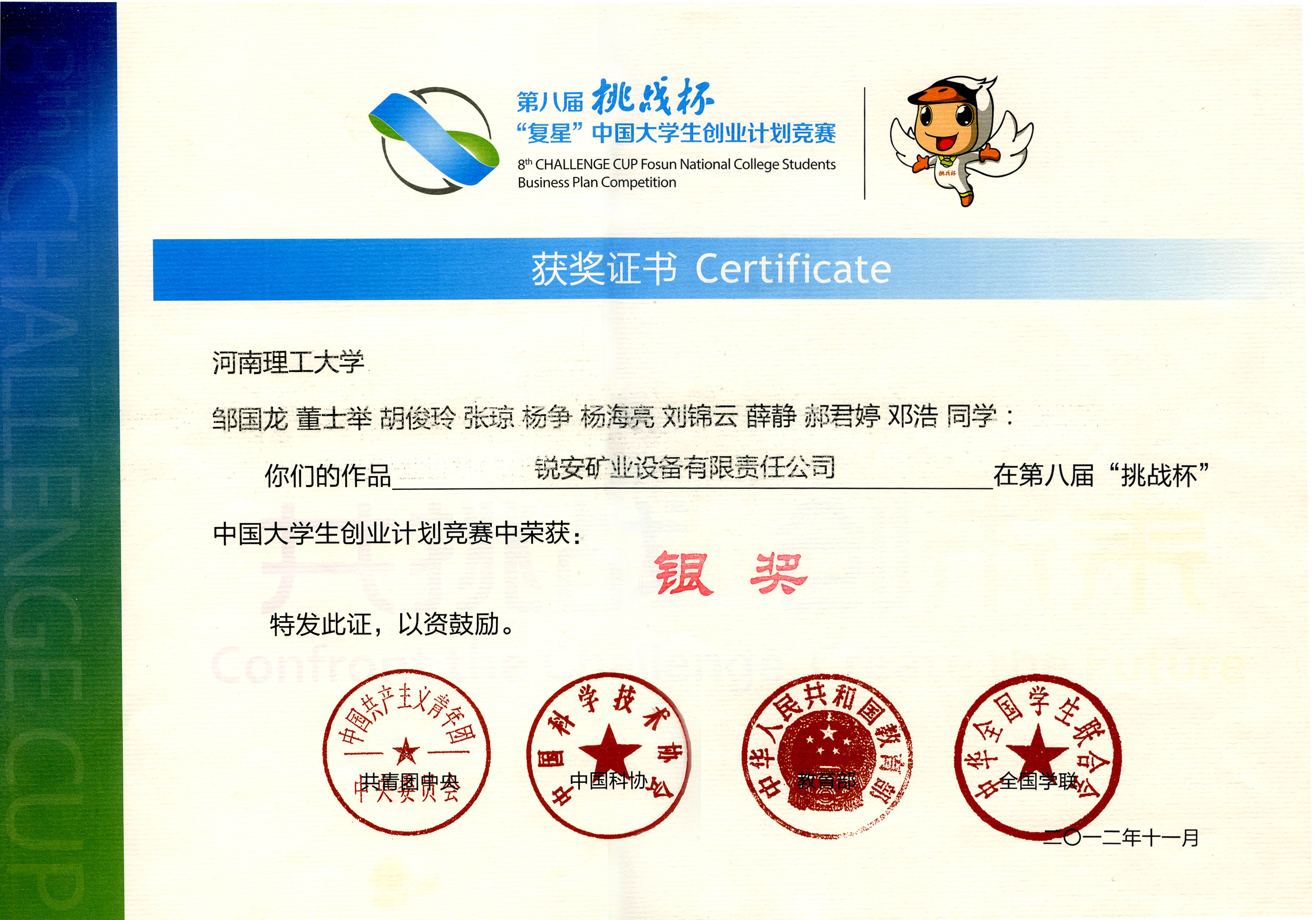 2012年11月28日,由共青团中央、中国科协、教育部、全国学联、上海市人民政府共同主办,同济大学承办,复星集团协办的第八届“挑战杯”复星中国大学生创业计划竞赛决赛在上海落下帷幕。